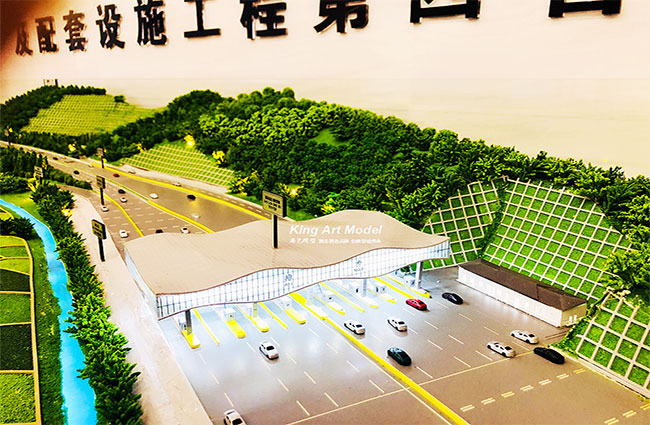 在道路路面上,港藝設計了各式車輛,小汽車、大巴車等路線行駛車道,還原道路真實場景。同時重要路段及收費站功能,做了剖面示意展示,便于施工中對項目的精準推敲。