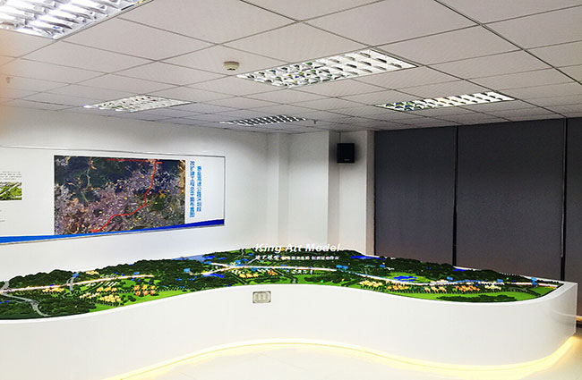 周邊住宅和廠房上也寫實精細制作,分別設置燈光,景觀周邊山體寫實制作,種植綠化樹叢底部設計顏色不同的LED小彩燈,使整個沙盤更加豐富,逼真的效果。