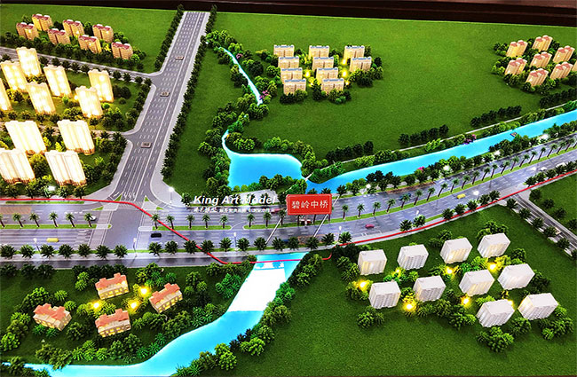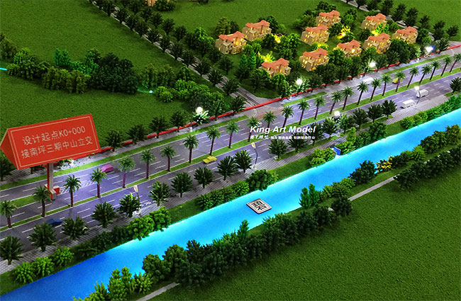 港藝公司根據坪山大道南段“青山環繞,水抱城流,園道格致,城景和一”的設計理念。展示全路段每個項目部的所在位置,項目部及周邊建筑均采用寫實制作手法,設置不同的燈光效果,并分組進行控制。在項目部、重點建筑、主要橋梁、起點和終點都設置了精美的標示牌。景觀周邊水系、綠植、采用寫實制作,種植綠化和設置燈光,使整個沙盤更加豐富逼真,還原城市真實場景。